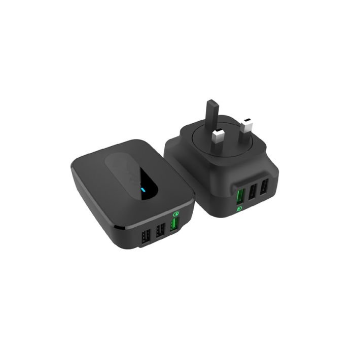 Qualcomm 3.0 Fast Charger. 1 x quick charge port with Qualcomm 3.0 | Charges up to 4 x faster than standard USB | Compatible with iPhone SE and above | Supplied in a gift box | Input AC100-240V, 50/60HZ | Output 25W, 5V.