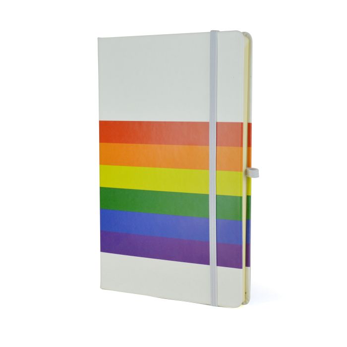 A5 PU notebook with vibrant rainbow design! Includes 80 lined pages, pen loop and elastic closure.