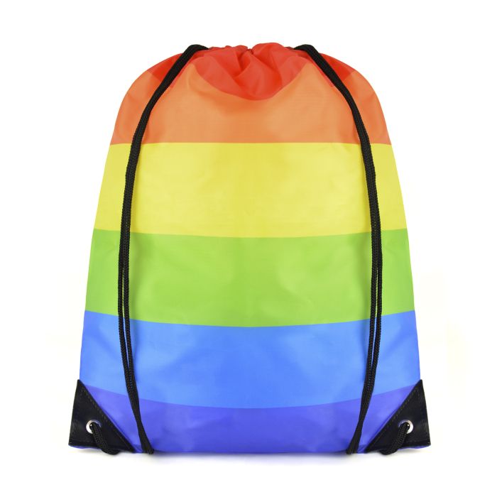 210D polyester drawstring bag with horizontal stripe rainbow coloured print. Features include a bright rainbow striped design to the front and back, black corners and black string straps.