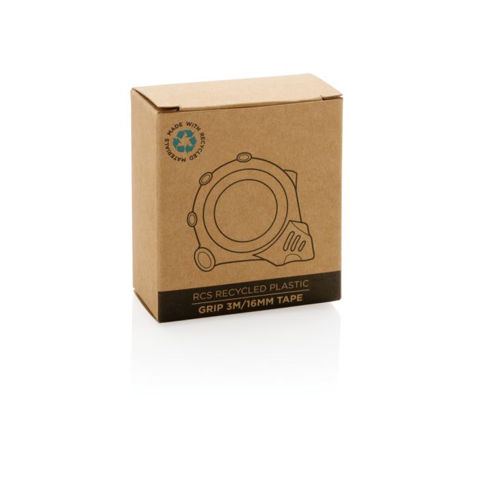 3 metre tape made with RCS (Recycled Claim Standard) certified recycled ABS. Total recycled content: 15% based on total item weight. RCS certification ensures a completely certified supply chain of the recycled materials. With deluxe TRP rubber grip for extra control. With release/hold button. With 16mm single sided tape, yellow with black carbon steel hook with two integrated magnets. With polyester wrist strap. Packed in FSC® mix kraft packaging