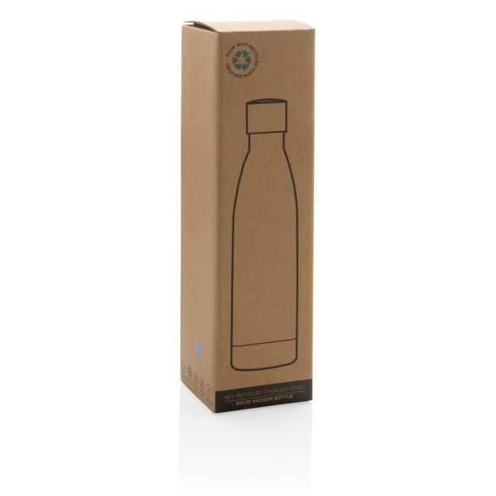 This RCS Recycled stainless steel vacuum bottle is designed for long-lasting enjoyment of your drinks! The double-wall recycled stainless steel vacuum construction keeps beverages chilled for up to15 hours or warm for up to 5 hours. This bottle fits most standard car cup holders so you can bring it with you anywhere. Made with RCS (Recycled Claim Standard) certified recycled materials. RCS certification ensures a completely certified supply chain of the recycled materials. Total recycled content: 93% based on total item weight. BPA free. Capacity 500ml. Including FSC®-certified kraft packaging.