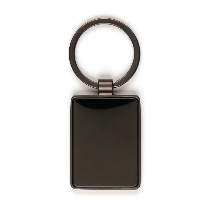 A sleek rectangular keyring made from durable zinc alloy featuring an iron split ring and a metal plate for added strength, finished in an elegant gun metal colour.
