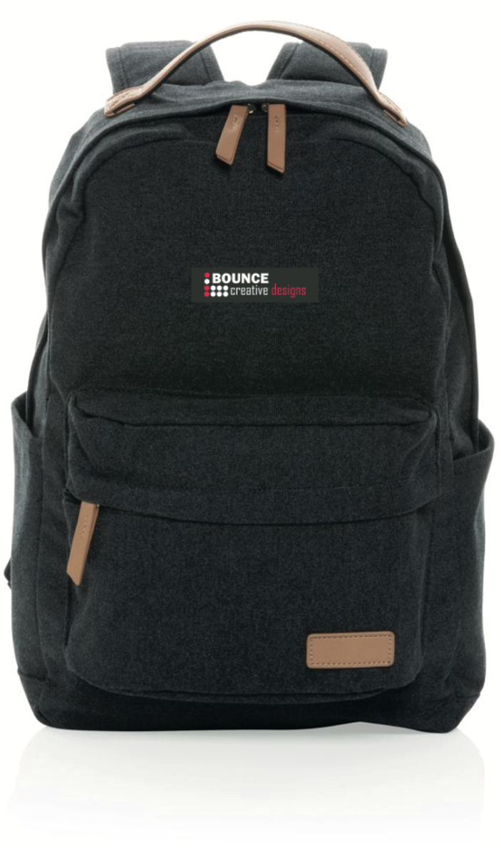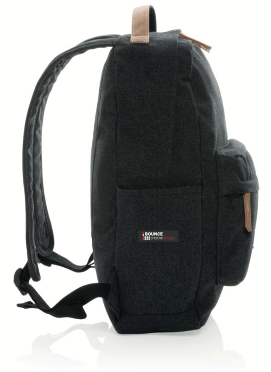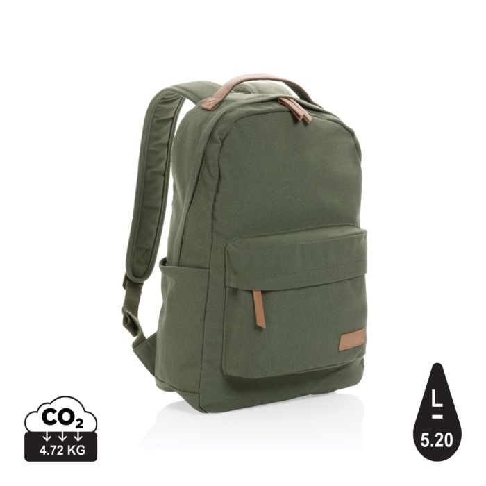 Promotional Recycled Canvas Backpack Impact AWARE. This 16oz. recycled canvas backpack is a classic for everyday use . This bag features a padded 14"laptop pocket and a spacious front and back pocket to hold your other daily essentials. Each laptop bag saves 2506.2 litres of water. 2% of proceeds of each Impact product sold will be donated to Water.org. Composition 60% recycled cotton and 40% recycled polyester. Lining in 150D recycled polyester.