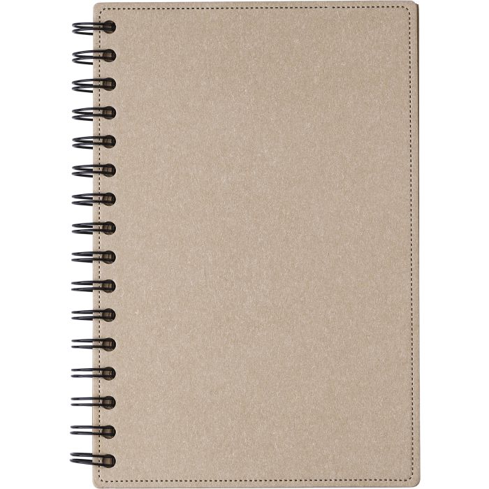 Recycled card hard cover, wire bound note book with 160 lined recycled brown paper pages which have a small recycled logo printed on the pages.