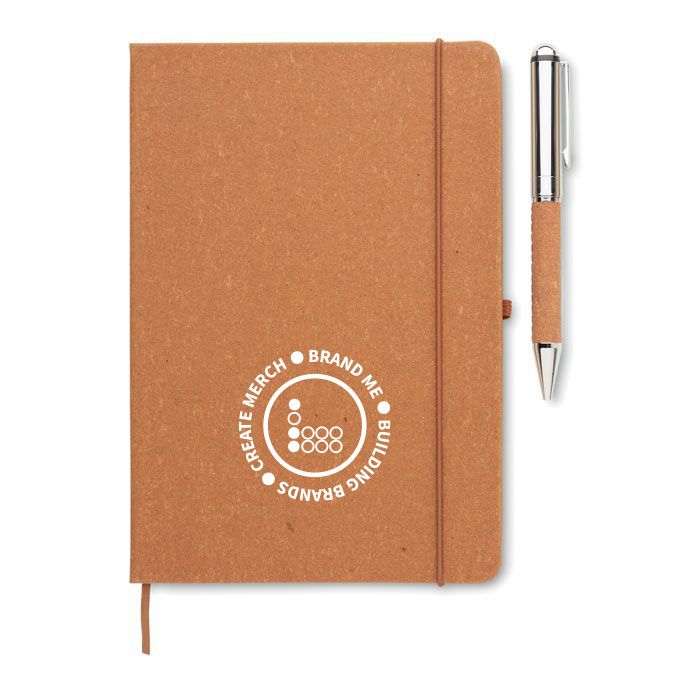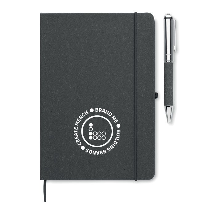 Promotional Recycled Leather A5 Notebook Set ELEGANOTE. Recycled leather (75%) A5 notebook with hard cover. Casebound. 160 lined pages made out of recycled paper (80 sheets). Matching elastic closure strap, ribbon page-marker and pen holder. Gift set with matching twist metal pen. Blue ink. Presented in a craft paper box.