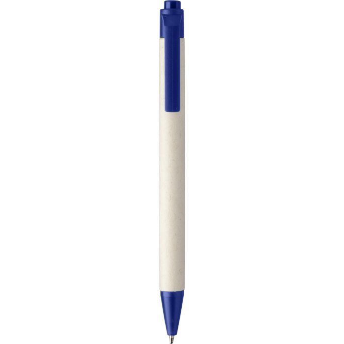 Recycled milk carton ballpen with recycled plastic coloured parts and blue ink.