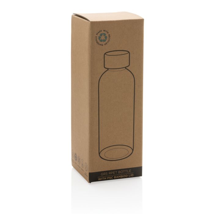 Promotional Recycled RPET Water Bottle With Bamboo Lid. This RPET water bottle is single-wall constructed and features a stylish FSC-certified bamboo lid. The body of the bottle is made from 100% GRS certified RPET. GRS certification ensures a completely certified supply chain of the recycled materials. Hand wash only. This product is for cold drinks only. Total recycled content: 75% based on total item weight. BPA free. Capacity 660ml. Including FSC®-certified kraft packaging.