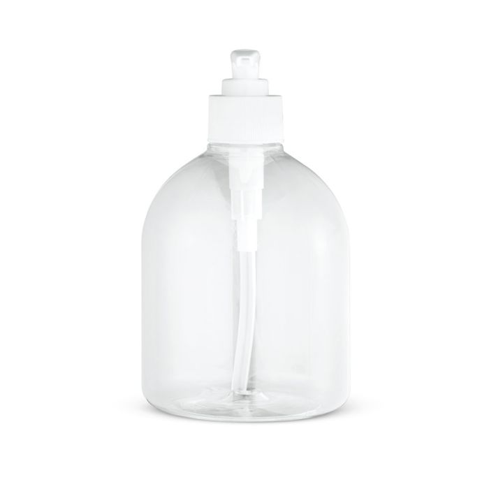 Bottle with dispenser in PE and PP. Volume-capacity 500 mL, refillable and reusable. ø85 x 150 mm