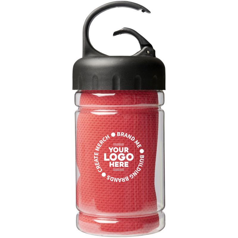 Promotional Remy Cooling Towel in PET Container. Quick absorbing, quick drying, and washable cooling towel made of strong and durable polyester for keeping cool during work-out or any outdoor activity. Remy Cooling Towel comes in a PET container with a carry handle with a built-in carabiner for easy carrying. Available in 5 fresh colours. Large decoration logo area on the container, decoration also possible on the cooling towel itself. Size: 30 x 80 cm.