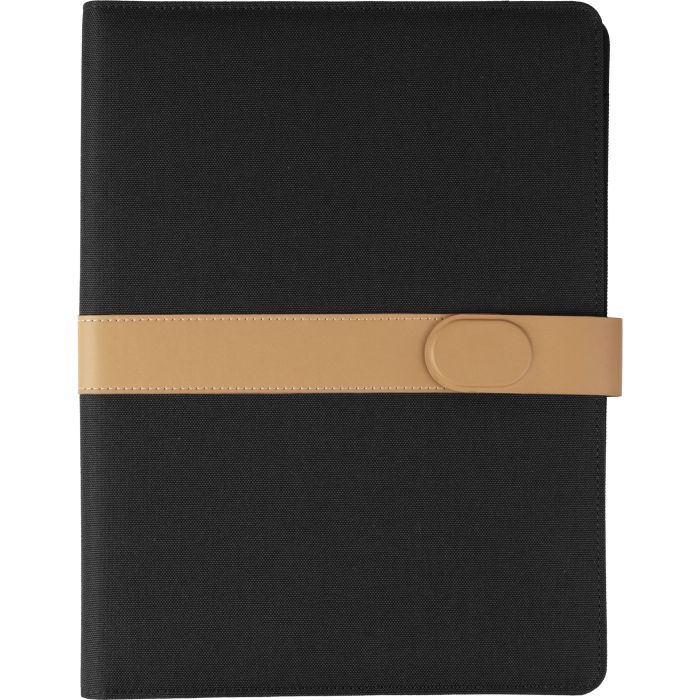 RPET Foldable portfolio (approx. A4) with PU detail on the cover. Includes a notebook with 20 lined pages, multiple compartments, pen loop and a magnetic closure. Individually packaged in a kraft sleeve.