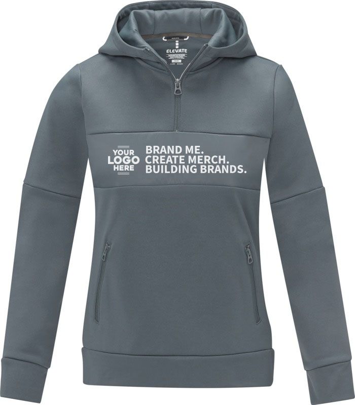 Quarter zip. Anorak model. Front pockets with zipper. Branded hangerloop. Easy grip zipper pullers. Shaped seams and tapered waist for flattering fit. Heat transfer main label for tagless comfort.