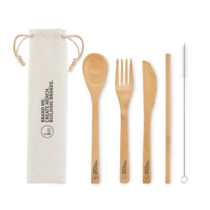 Printed SETSTRAW Bamboo Cutlery And Straw Set In Pouch. This re-usable bamboo cutlery set comes in a handy canvas pouch. Great to take with you if you bring your lunch with you to work. They will also look good on any dining or kitchen table. The bamboo straw comes with a cleaning tool, so you can easily reuse it. This set of utensils includes a knife, fork, spoon and straw. All made from durable bamboo.