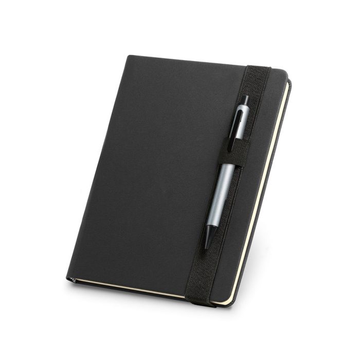 A5 notepad with hardcover in PU. This notepad has 280 plain ivory pages, pen holder (pen not included) and elastic band. Supplied in a non-woven pouch. 145 x 210 mm | Pouch: 185 x 240 mm