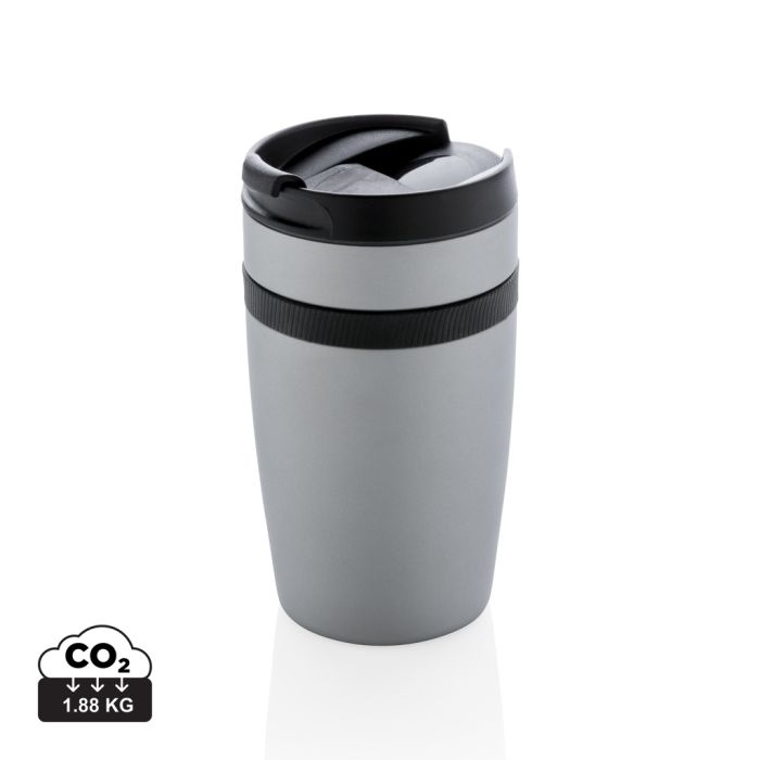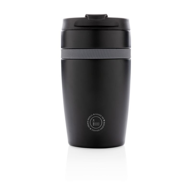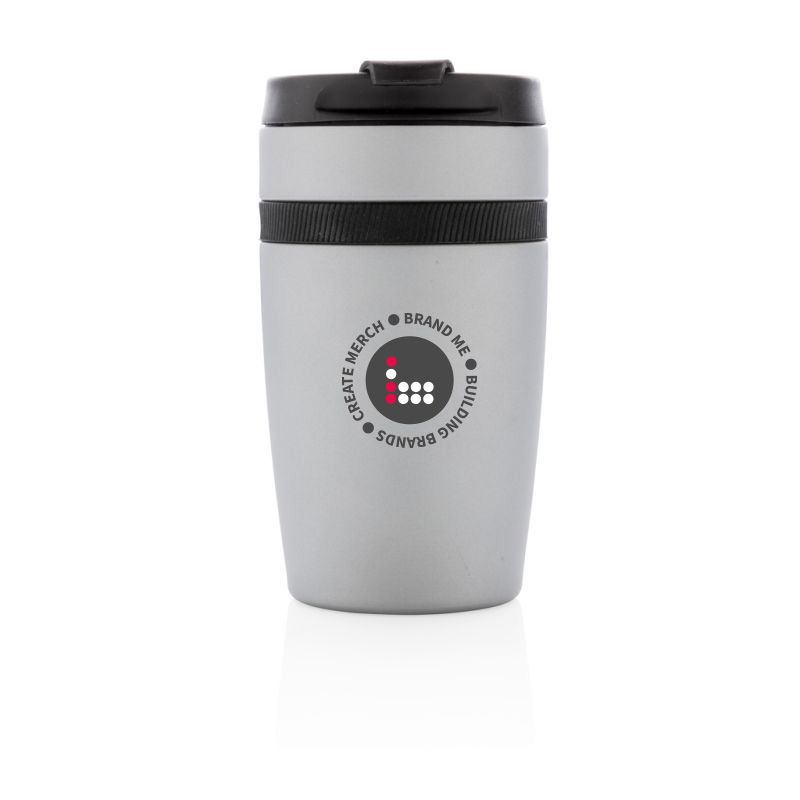 Printed Sierra Vacuum Travel Mug Leak Proof. Just the right size, a perfect fit for most coffee machines. This vacuum insulated double wall stainless steel design tumbler with silicone band detail. Keeps your drinks hot for up to 5h and cold for up to 15h. Content: 280ml. Registered design®