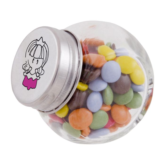 Small glass jar with 30g of milk choco's Supplied with a mix of chocolate colours.