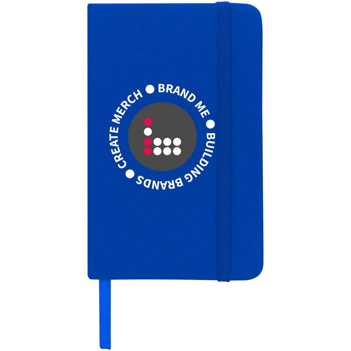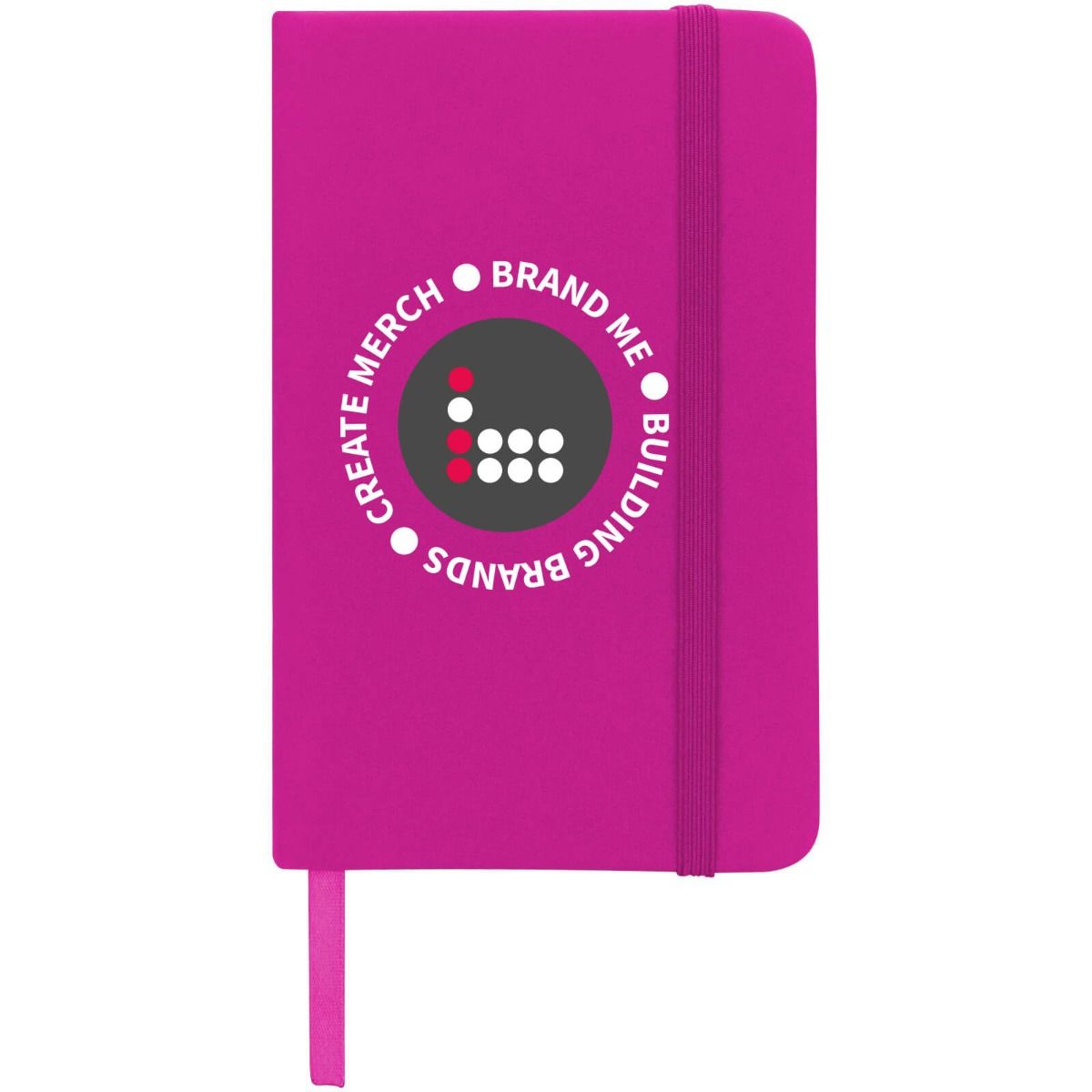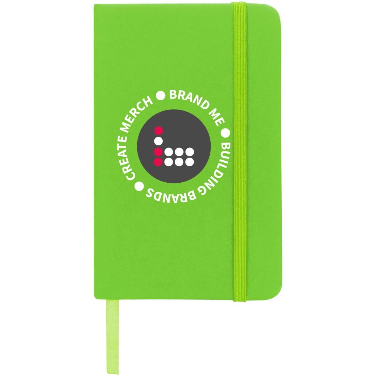 Promotional Spectrum A6 Notebook Hard Cover. Besides being an office essential, the Spectrum notebook is also a great item to promote any brand. The hardcover notebook consists of cardboard covered with a soft touch PVC cover. The 96 lined responsibly sourced pages of 60 g/m² are ideal for jotting down quick ideas or long notes. The A6 reference size is practical, as it fits smoothly into the average bag and is easy to hold. The ribbon of the bookmark and the elastic closure are in the same colour.
