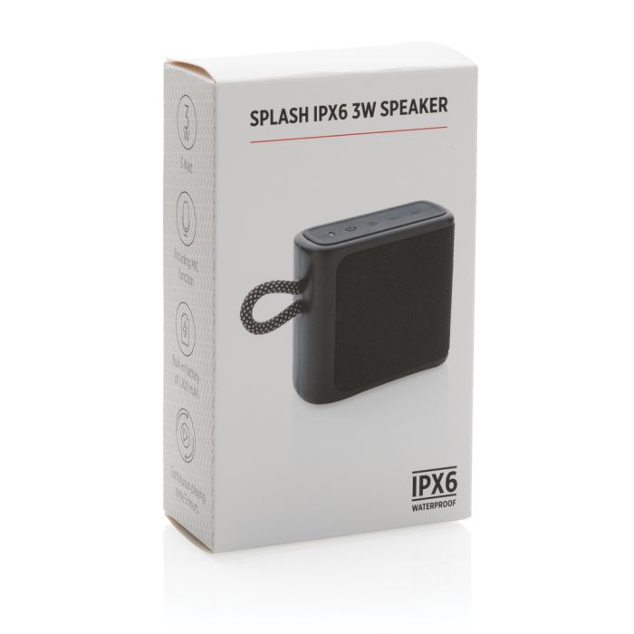 Printed Splash Waterproof Wireless Speaker IPX6 3W. IPX 6 waterproof 3W speaker made from ABS and fabric. The 1200 mah battery allows a play time of up to 5 hours. Re-charging takes 3 hours. Operating distance up to 10 metres using BT 5.1 With mic and pick up function to answer calls. With type C input port and type C charging cable.