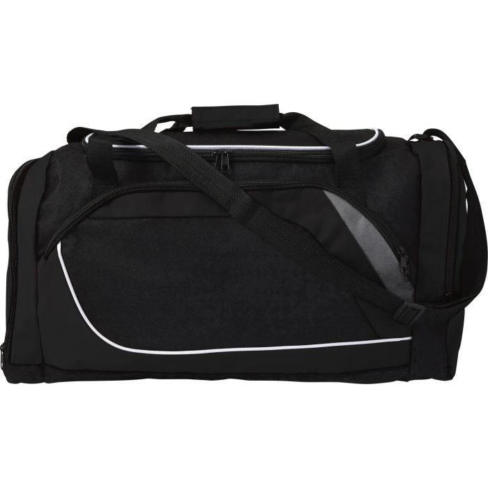Polyester (600D) sports bag with one big compartment, one pocket on the side and a special compartment for shoes. All with black zippers.