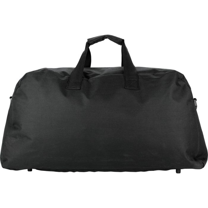 Polyester (600D) sports/travel bag with zipped external pocket and one main zipped compartment.