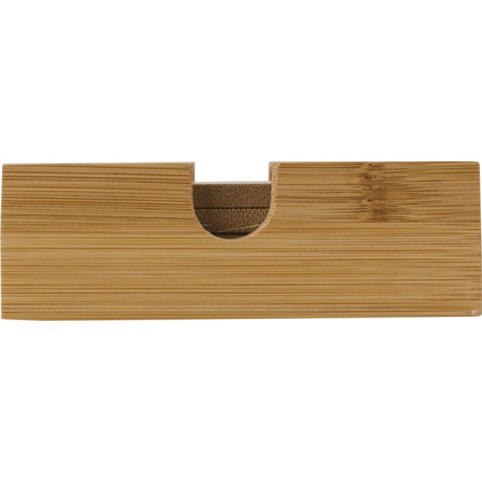 Promotional Square Bamboo Coaster Set With Tray. Bamboo coaster set (4pc) in a bamboo tray. Packaged in gift box.
