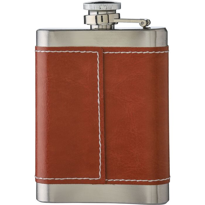 Stainless steel hip flask with a PU sleeve. Individually packaged in a brown cardboard box.