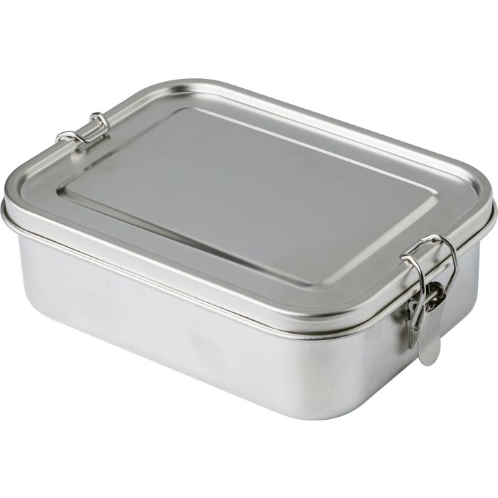 Stainless steel lunch box with a 1100 ml capacity and clip closure. Individually packaged in a brown cardboard box.
