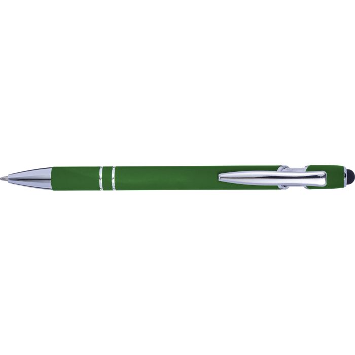 Promotional Stylus Pen with Rubber Finish. Ballpen with rubber finish and rubber tip for capacitive screens. The tip and clip are silver coloured plastic. Blue ink.
