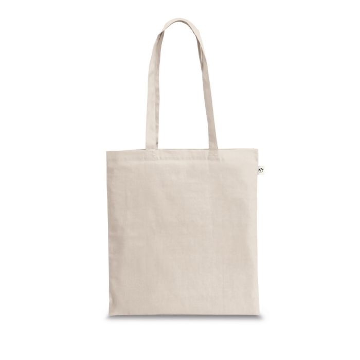 Bag made from recycled cotton (70%) and polyester (30% rPET) (150 g/m²), with 65 cm handles. Recycled cotton is solid-colored and undyed. The raw material is used in its original form and color, without the use of dyeing or bleaching chemicals, contributing to a lower impact. The solid color is obtained by choosing recycled yarn with the same shade, and impurities and color variations may appear