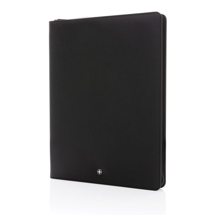 Promotional Swiss Peak Eco Heritage A4 Portfolio With Zipper Recycled PU. The Swiss Peak Heritage collection speaks the language of modern elegance. Presented in iconic Italian recycled PU cover with zipper . The inside provides a tablet/phone stand, gadget holders, business cards slots, sleeves for your notes and papers plus a pen loop. With lined 20 sheets A4 stone paper notepad. the portfolio is made with RCS (Recycled Claim Standard) certified recycled materials. RCS certification ensures a completely certified supply chain of the recycled materials. Made with 100% recycled RCS certified recycled PU. Total recycled content: 9% based on total item weight. PVC free.