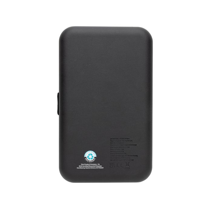 Hard shell travel case with integrated 3-in-1 wireless charger made with RCS recycled PU Total recycled content: 5% based on total item weight. RCS certification ensures a completely certified supply chain of the recycled materials. The travel case has storage space for passport, multiple cards and has an integrated cable holder. The travel case comes equipped with a magnetic 15W wireless charger and an additional 5W wireless charger suitable for earbuds cases or other small wireless chargeable devices and a 2.5W wireless charger for smartwatches ( Apple watches only). Perfect to carry all your valuables and charge all your devices. Inside is also a small magnetic wallet that can be taken out. Including 120 cm TPE cable. Packed in FSC® mix packaging. Item and accessories 100% PVC free. Minimum Input: 9V/3A for optimal use. Output: Phone: 9V/1.1A; 9V/1.67 A/(15W), Earbuds: 5V/1A (5W), Watch: 5V/0.5A.