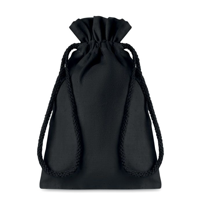 Promotional TASKE SMALL Cotton Drawstring Gift Bag Black. Small gift cotton draw cord bag. Size approx. 14 x 22cm. 105 gr/m². Produced under a certified standard for the use of harmful substances in textile.