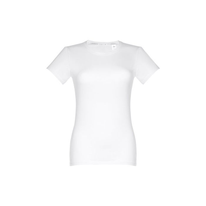 100% cotton jersey Women's fitted T-shirt (190 g/m²) with carded cotton yarn. Contains a thin jersey collar with satin ribbon reinforcement. Piece cut and sewn with a double seam on the sleeve and hemline