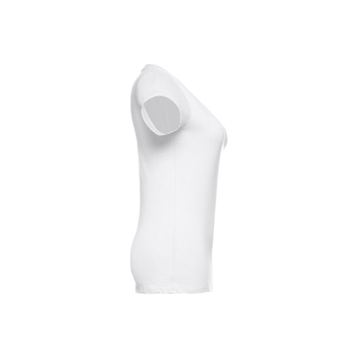 100% cotton women's jersey fitted t-shirt (150 g/m²) with carded cotton yarn. Features a jersey collar with overlaid" V" neckline, reinforced inside with jersey ribbon. Piece cut and sewn with the double seam on the sleeves and hemline. Sizes: S, M, L, XL, XXL