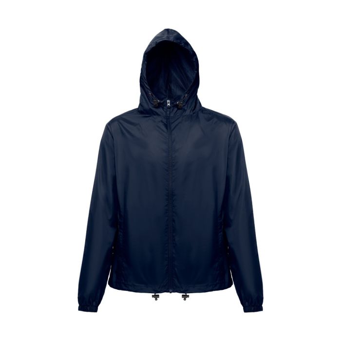 Waterproof windbreaker (Unisex) in 100% recycled nylon taffeta fabric (65 g/m²). Front opening with YKK® zipper - a brand that uses modern equipment and high quality control. The hood is lined with mesh and has drawstrings for tightening. It has eyelets for easy ventilation, elastic fastening with stoppers at the and bottom and zippered side pockets. Sizes: XS, S, M, L, XL, XXL