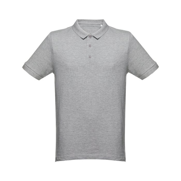 Short-sleeved men's polo made 100% carded cotton (240 g/m²) (colour: 183: 85% cotton/15% viscose). Regular cut with collar and ribbon sleeves and piqué collar reinforcement. Reinforced collar with 3 matching colour buttons (extra button inserted in the inner seam). Piece cut and sewn with small side openings at the bottom of the polo. The visible label is removable