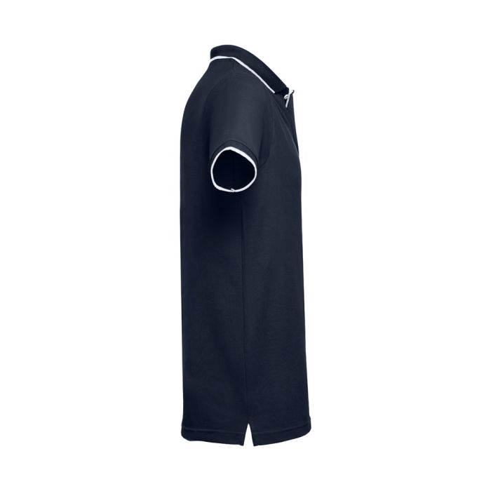 Short-sleeved bicolour polo for men in piqué 100% cotton carded (210 g/m²) (colour: 183: 85% cotton/15% viscose). Two-colour contrast on the collar, sleeve and placket. Features a collar and cuffs in Rib. Reinforced placket with 3 contrasting colour buttons (extra button inserted in the inner side seam). Fitted waist and small side vents at the hemline of the polo