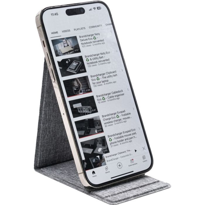 A sustainable phone and tablet holder made from RPET, certified by the Recycled Claim Standard (RCS). It features 15W fast wireless charging, is MagSafe compatible, and includes a silicon MagSafe sticker. With an adjustable angle and foldable design, it’s a practical, eco-friendly accessory for any workspace. Patent protected for unique functionality. Made from 0.5 recycled PET bottles