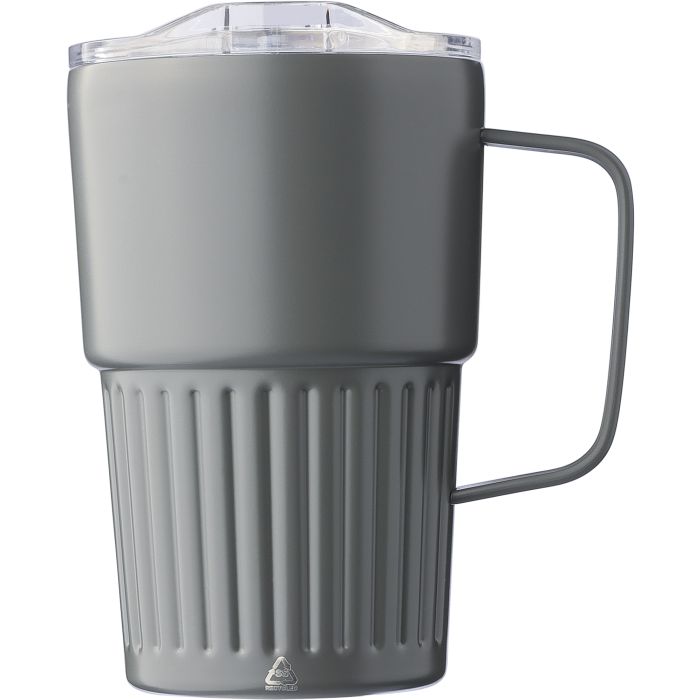 Recycled stainless steel drinking mug (450 ml) with a slide closure lid. Includes an engraved recycled logo on the body. Individually packaged in a brown cardboard box.