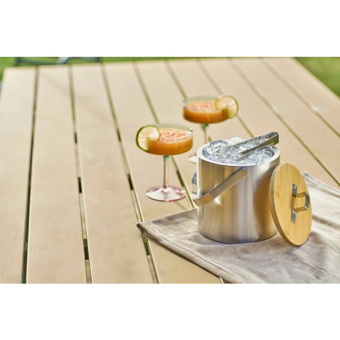 Double-walled 1200ml stainless steel ice bucket with a bamboo lid,ice tongs and a stainless steel carrying handle. Individually packaged in a brown cardboard box.