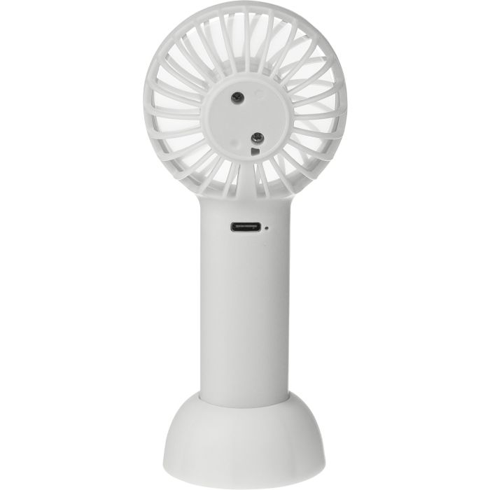Rechargeable personal fan with 3 speeds and a Type-C charging port and cable. Includes a stand for upright positioning. Individually packaged in a brown cardboard box.