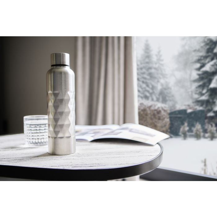 Recycled steel single-walled drinking bottle. Features a diamond-shaped texture on the body, screw top lid and a recycled logo on the bottom of the bottle. Individually packaged in a brown cardboard box.