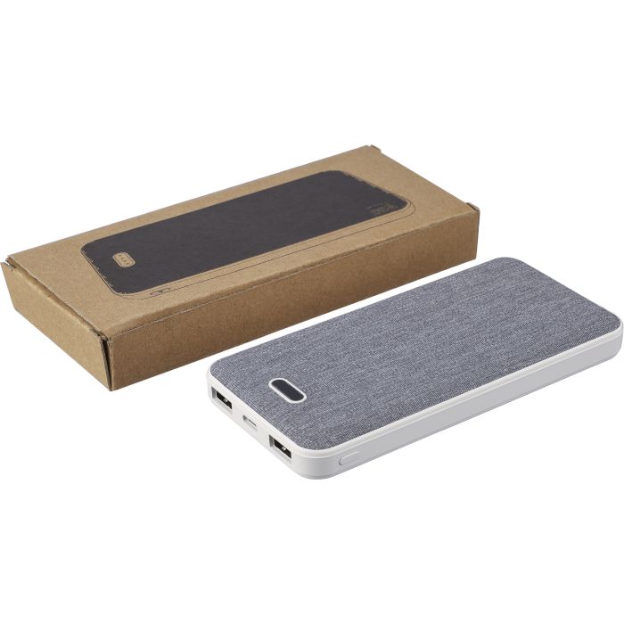Recycled plastic and rPET power bank with 10,000 mAh capacity, dual USB and Type-C ports, charging display and rPET logo on top. Individually packaged in a brown cardboard box.