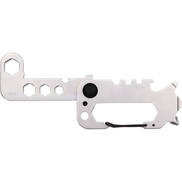 Crafted from hardened 420 martensitic stainless steel. The multi-tool combines 8 essential tools in a compact twist design that fits comfortably in your hand. This versatile tool includes a wire cutter, bike spoke wrench, multiple spanners (5.5-12 mm), keychain, bottle opener, carabiner hook, Phillips and flat screwdrivers and a ruler. It’s both sleek and practical, ideal for everyday tasks. Packaged in a black box with a soft foam insert for protection.