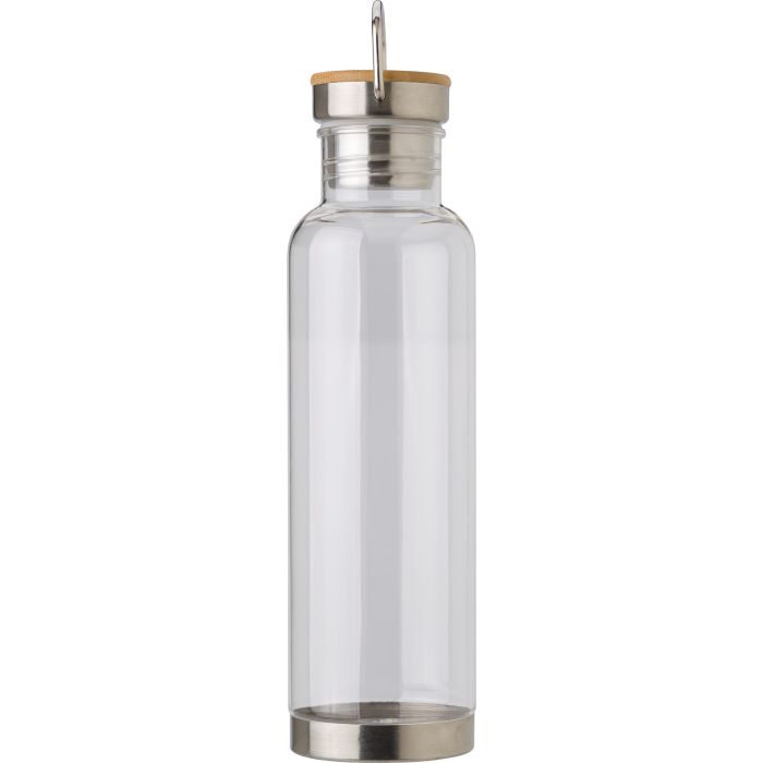 Promotional Tritan Water Bottle With Wood and Metal Lid bottle (800ml). Tritan bottle (800 ml) with stainless steel base and cap. Individually packaged in a brown cardboard box.