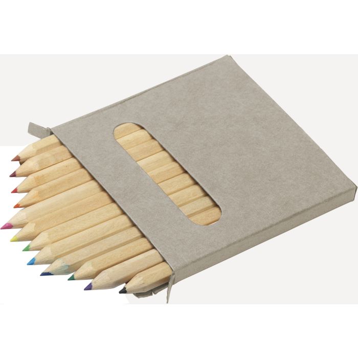 Twelve small colour pencils in a recyclable box.