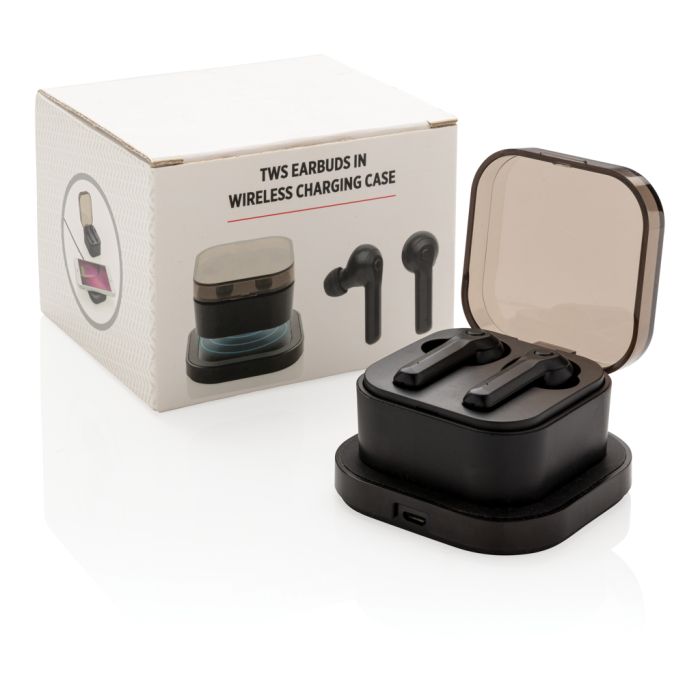 Promotional TWS Earbuds In Wireless Charging Case. Ultimate freedom while listening to your favorite music with these true wireless earbuds. Simply pair both ABS earbuds to listen to your music in stereo and answer calls (mono). The earbuds come in a stylish charging case which can be charged wirelessly by the included 5W wireless charger. This charger can also be used to charge your mobile phone. The wireless charger is compatible with all QI enabled devices like Android latest generation, iPhone 8 and up. Including 150 cm micro cable. The earbuds use BT 4.2 for smooth connection and have a 50 mAh battery that allows a play time of up to 3 hours and can be re-charged in 2 hours in the charging case. The wireless distance is up to 10 metres. Includes different size ear tips. Input 5V/1A Wireless output: 5V/1A.