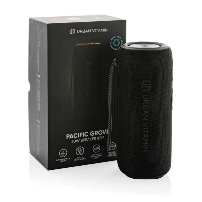 Urban Vitamin Pacific Grove RCS rplastic 30W Speaker IPX7. The Pacific Grove Wireless speaker provides you with the freedom to enjoy your music without any limitations. This robust 30W speaker is made to withstand various conditions, offering everything you need for an immersive music experience. Its practical integrated lanyard and durable, IPX 7 water-resistant design ensure that you can bring your favourite tunes with you wherever you go. Additionally, you have the option to connect two speakers together using the stereo pairing function, creating an authentic stereo sound experience. A full charge allows you to play music up to 8H on a single charge.