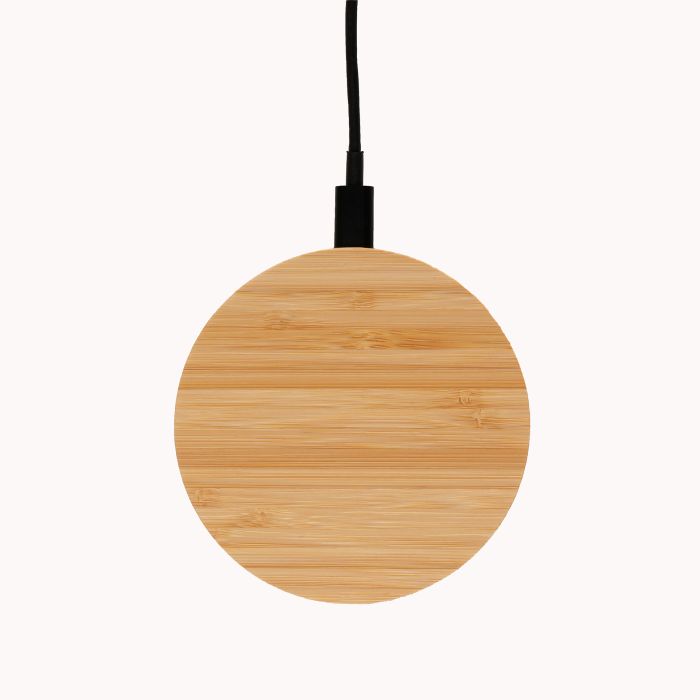 Circular bamboo 5w wireless charger with TYPE-C input port. Supplied with a 30cm USB-C to USB-C charging cable. Will charge most QI enabled devices. *Please note due to the finish of the bamboo material, spot printing can be inconsistent on this product.