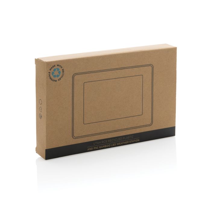 Large weather station made with RCS (Recycled Claim Standard) certified recycled ABS and FSC® 100% bamboo. Total recycled content: 65 % based on total item weight. RCS certification ensures a completely certified supply chain of the recycled materials. With high quality LED screen. Functions: clock, alarm, calendar, temperature, humidity and moon phase function, 12/24 hour option, Fahrenheit/Celsius and humidity recording. Including 100 cm type C charging cable made from RCS certified recycled TPE. Packed in FSC® mix kraft box.
