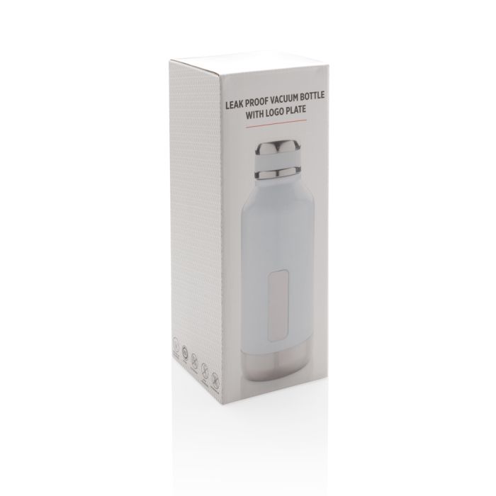 Engraved Vacuum Metal Bottle Leak Proof With Logo Plate. Leakproof vacuum insulated bottle with twist off lid. With unique logo position on the front. 304 stainless steel inner and 201 stainless steel outer keeps your drinks hot 5h and cold 15h. Content: 500ml.